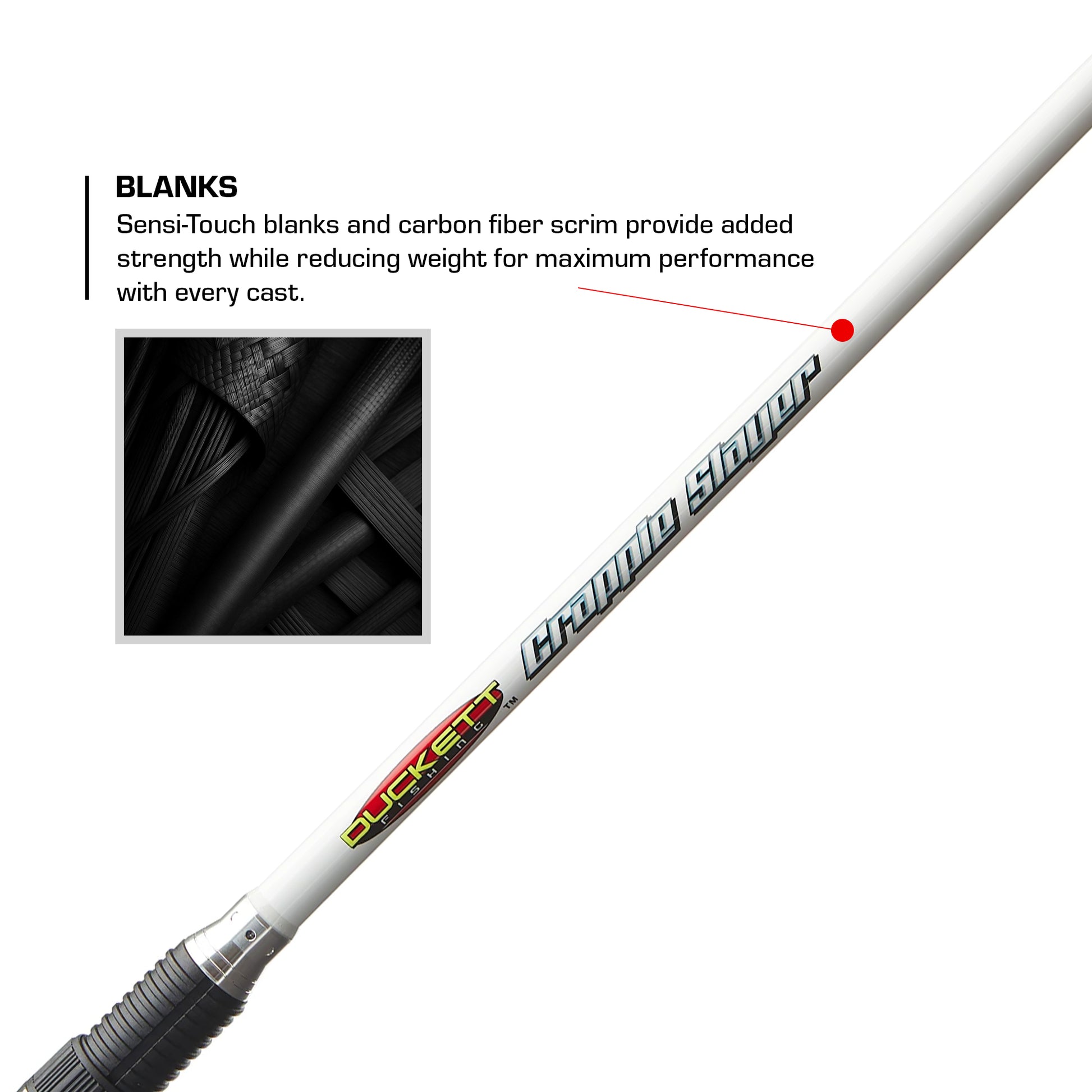 Description: Added backbone for deeper water and bigger crappie. Pieces: 1-piece Handle Length: 8.6" Guides: Micro-guides Guide Count: 6+1 Techniques: Drop shot, brush piles, dock shooting |