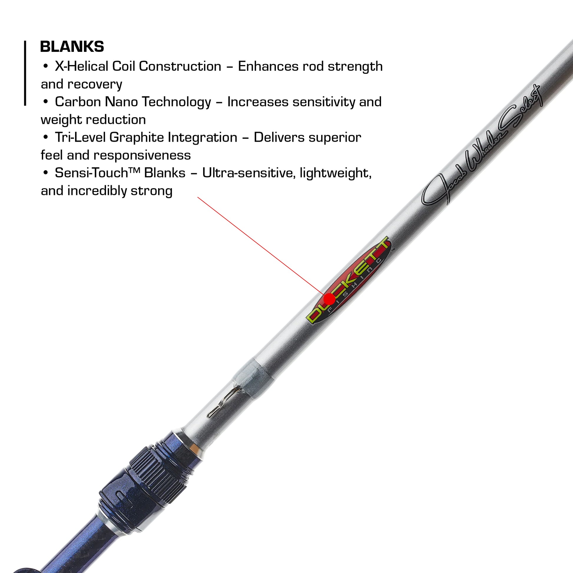 Introducing the new Jacob Wheeler Signature Series Select rod line, designed for the most competitive anglers. This series boasts cutting-edge features, including X-Helical Coil Construction, Carbon Nano Technology, and Tri-Level graphite integration, resulting in Sensi-Touch blanks that are ultra-sensitive, lightweight, and incredibly strong.
