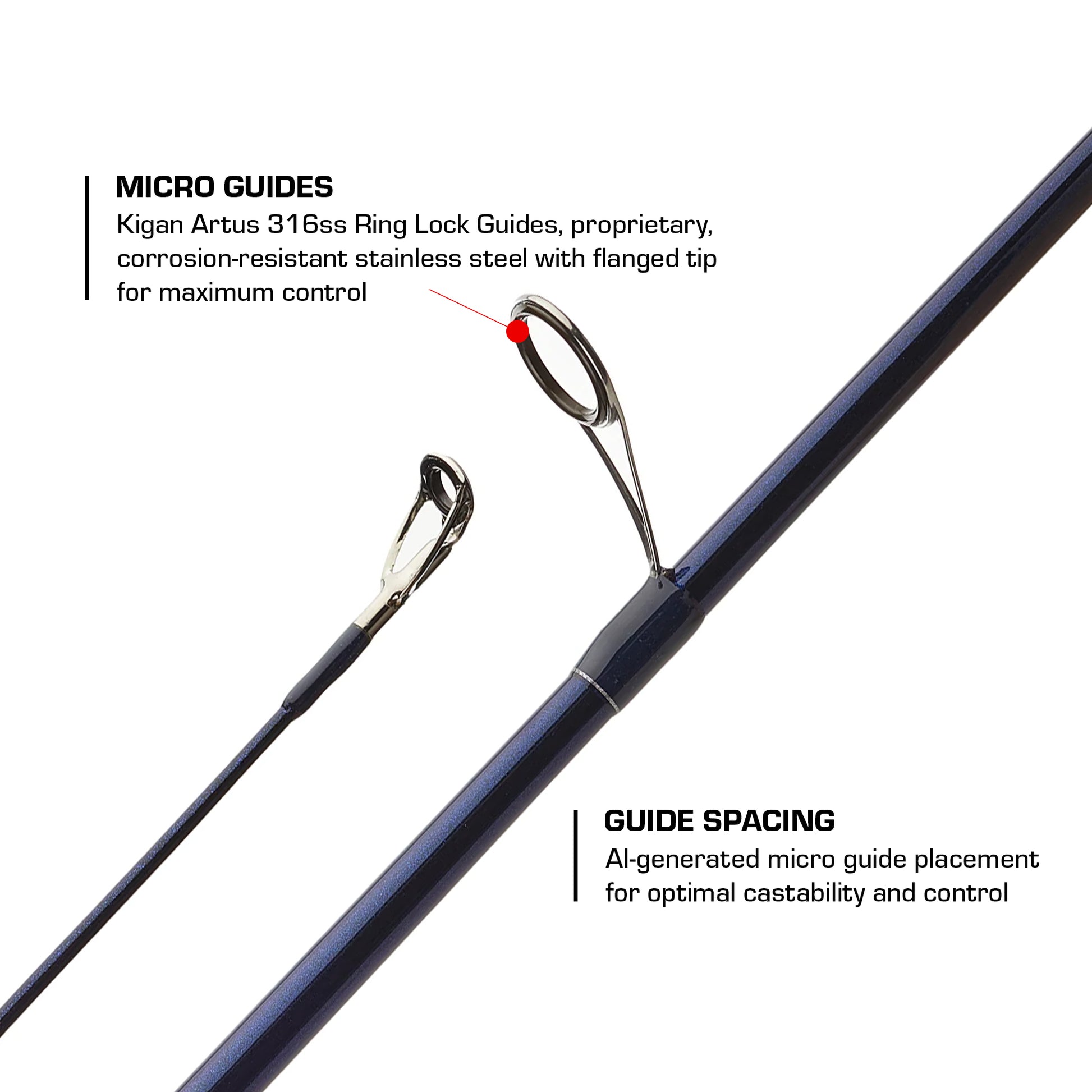 The two-layer carbon fiber scrim adds to the durability of the rod, while the proprietary Kigan Artus 316ss ring locks and double flanged tip provide unmatched sensitivity and control. The double foot elevated stripper guide ensures accurate casting and minimizes line friction.