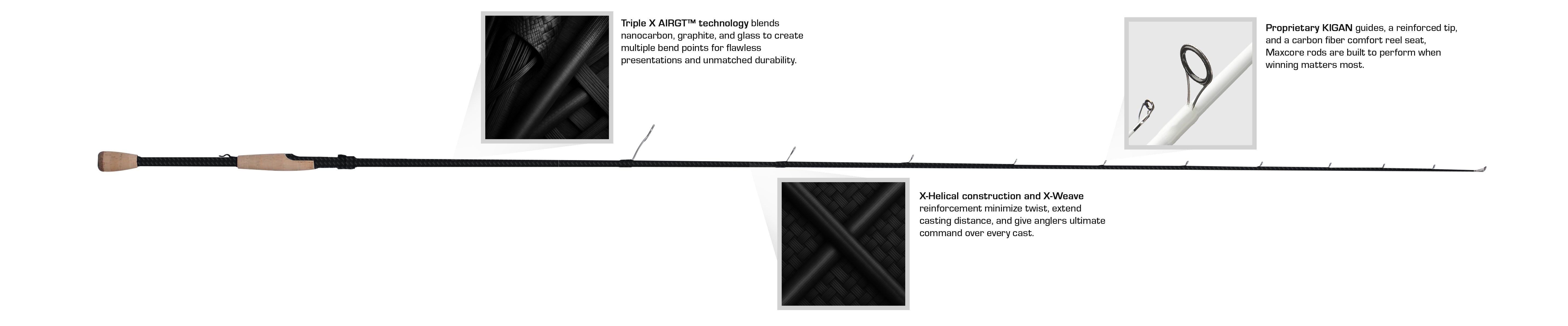 Born from AI innovation and advanced materials, Maxcore rods deliver the perfect balance of strength, sensitivity, and control. Triple X AIRGT™ technology blends nanocarbon, graphite, and glass to create multiple bend points for flawless presentations and unmatched durability. X-Helical construction and X-Weave reinforcement minimize twist, extend casting distance, and give anglers ultimate command over every cast. With proprietary KIGAN guides, a reinforced tip, and a carbon fiber comfort reel seat, Maxcore rods are built to perform when winning matters most.
