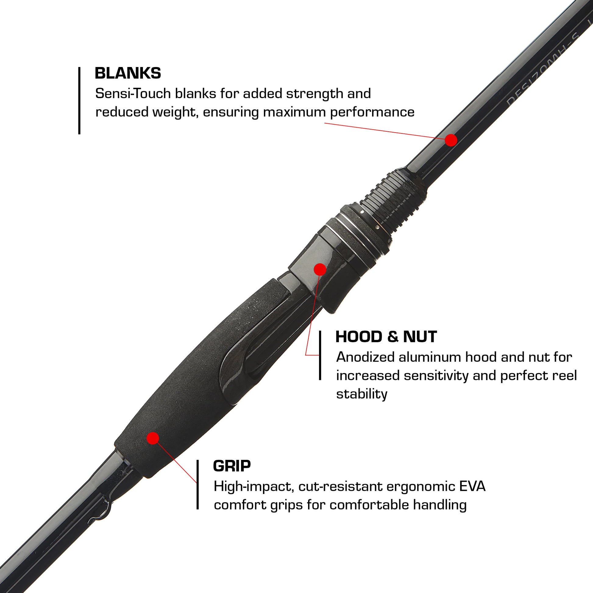 - Blank to Hand Transition: Semi-exposed blank for increased sensitivity in addition to an ergonomic carbon fiber grip